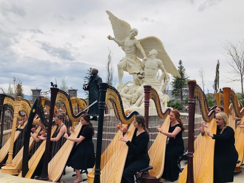 Video highlights include scenes with the dancing black horse, dramatic fight scenes portrayed by Boyé & the Evermore actors, and 28 harpists. Boyé put a message out on social media asking for a harpist and over 600 harpists reached out to him. “I didn’t realize how many harpists there were out there. I even got a DM from harpist in London and in South Africa who wanted to fly in for the videoshoot. I’m always amazed by the power of social outreach!” He ended up selecting 28 Utah based harpists and his production team had to lift over $2 million worth of harps into a fountain for the video shoot.