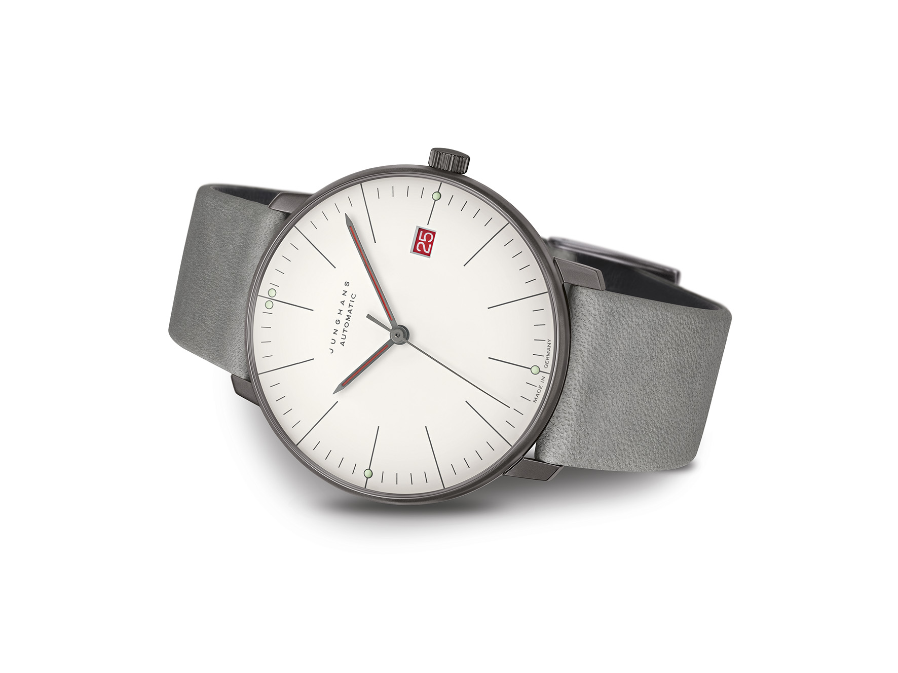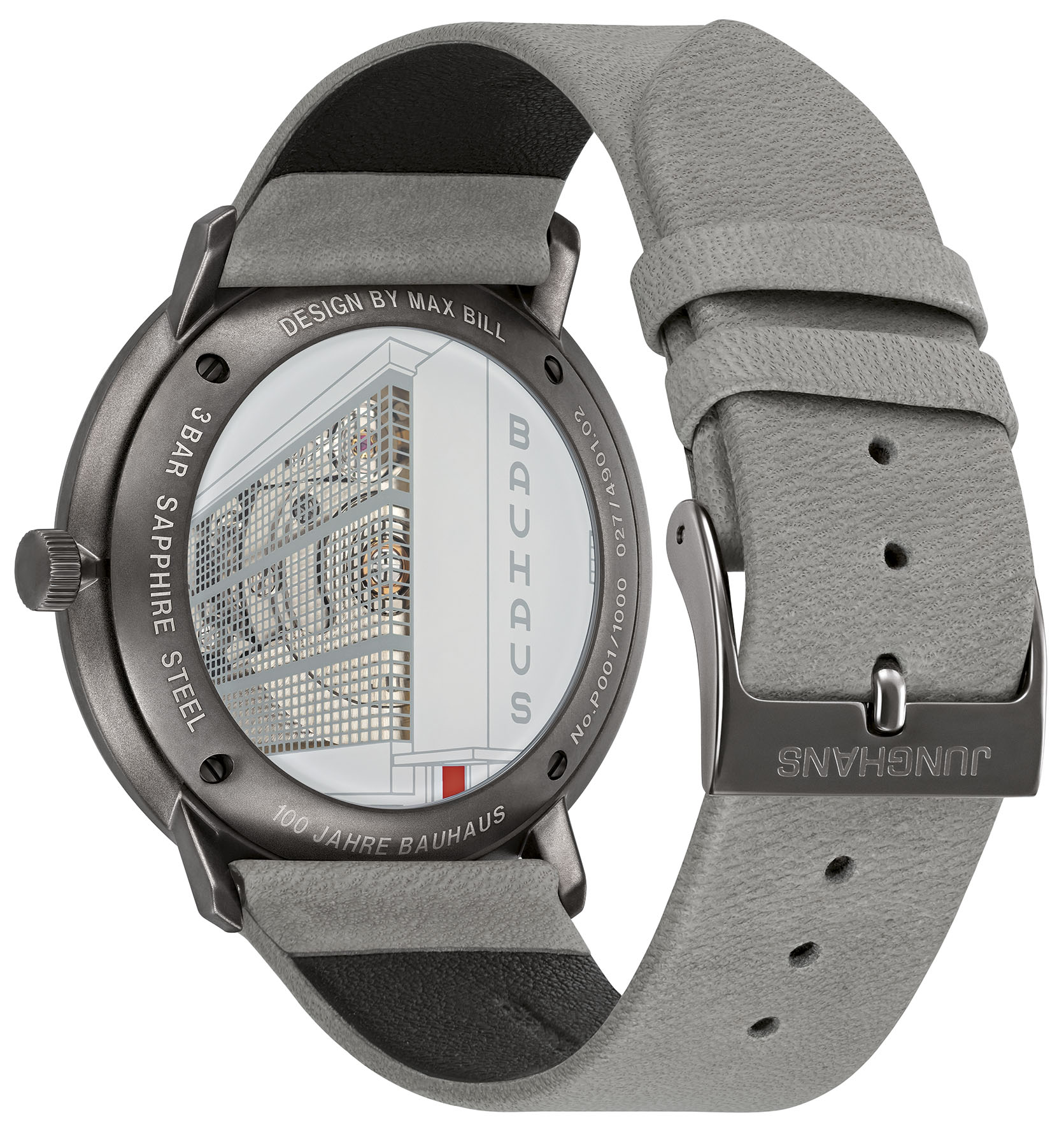 This watch bears the fundamental ideas ingrained in the very fabric of the Bauhaus. The matt silver dial commemorates the white walls of the building in Dessau, and the anthracite coloured case is representative of the striking façade. Designed in the colour of the architects, the grey strap is inspired by the construction element of the Bauhaus: concrete. Guaranteeing ideal readability thanks to their clear and simplistic form, the red hands mirror the colour design of the famous red doors of the Bauhaus in Dessau. A hue which is even more prominent in the red date wheel.