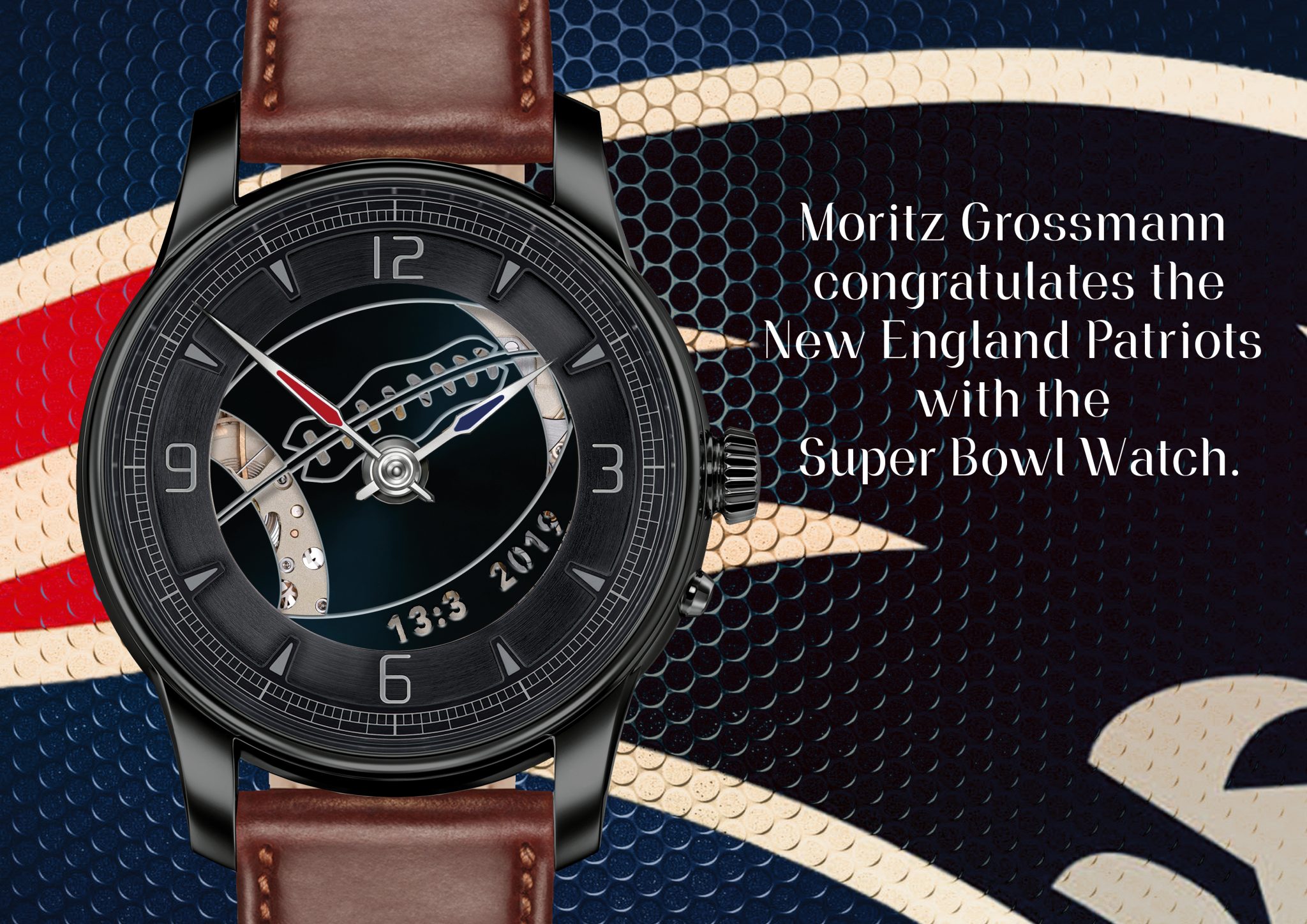 Moritz Grossmann congratulates the New England Patriots on their incredible success. 13:3! This is already the sixth Superbowl title for the Pats. The Moritz Grossmann Superbowl Watch is a unique piece with an RRP of 13,400 EURuros excl. VAT in the USA.